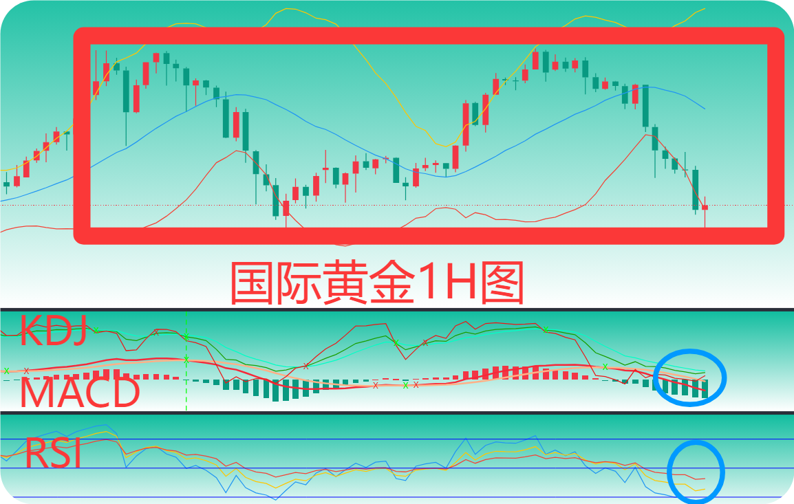 ❸:1小时级别上:金价沿 5 期均线向下,连阴跌破 4210 美元,MACD 死叉后绿柱加深,KDJ 进入超卖区间(20 附近)。下方支撑 4195 美元,上方阻力 4220 美元(10 期均线),短期偏空但需防超卖反弹。