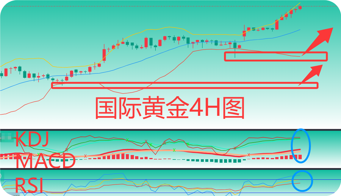 ❷:4小时级别上金价再创新高,价格处于上轨附近。布林带开口扩大,MACD红柱放量中,金叉运行,多头动能有所加强;RSI 技术指标处于强势状态中。