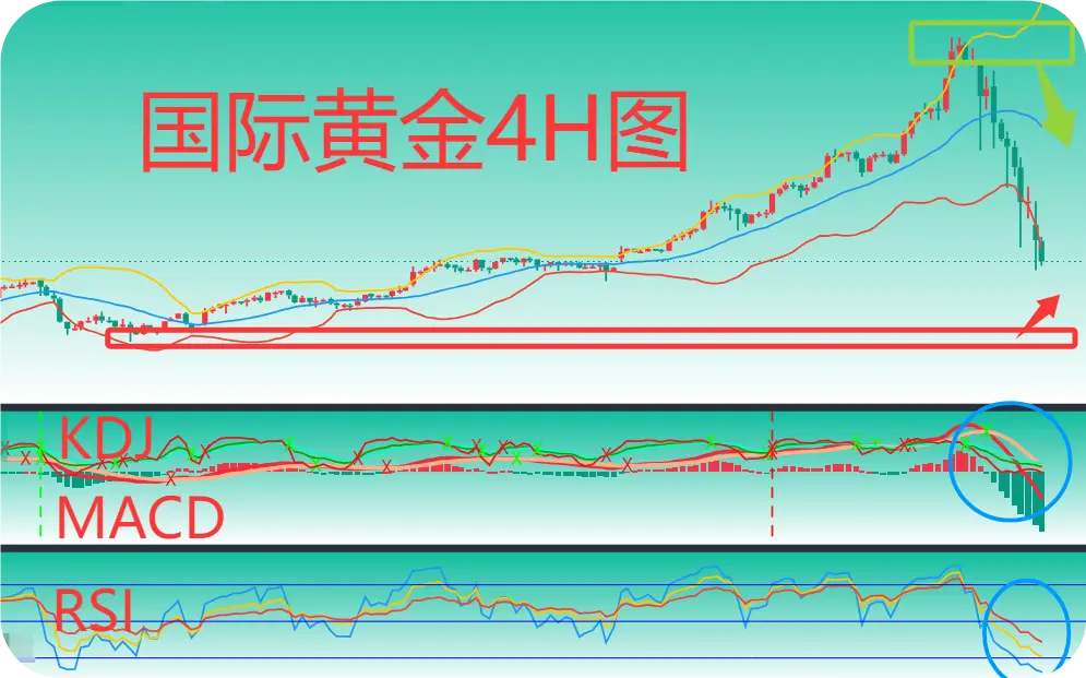 ❷:4小时级别上:金价极速下跌,价格处于下轨附近。布林带开口扩大,MACD绿柱放量中,死叉运行中,空头动能有所加强;RSI 技术指标处于超买回落状态中。