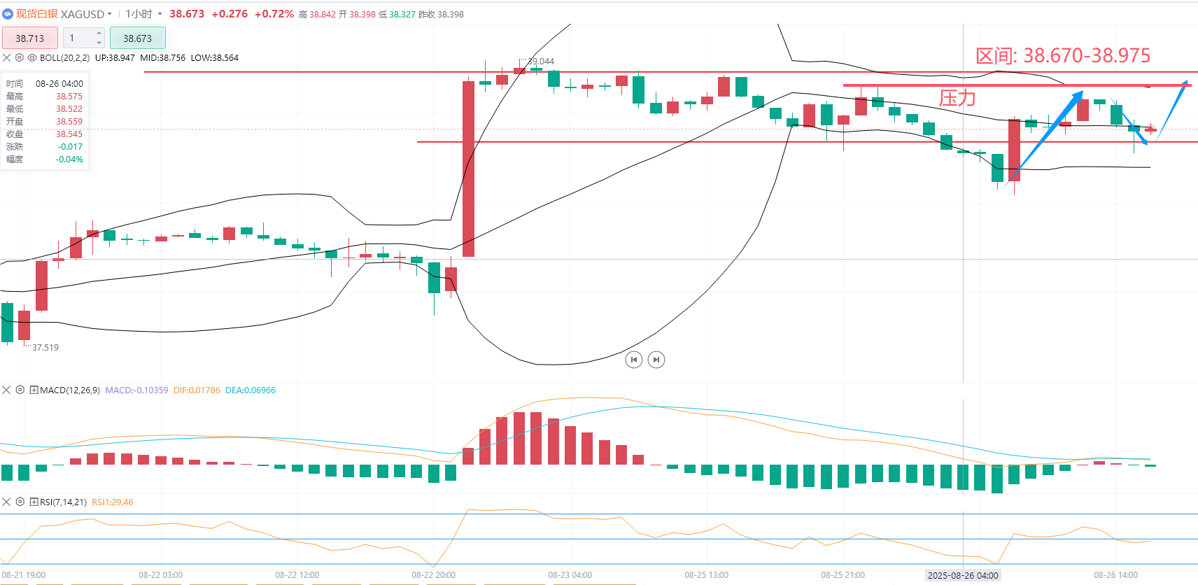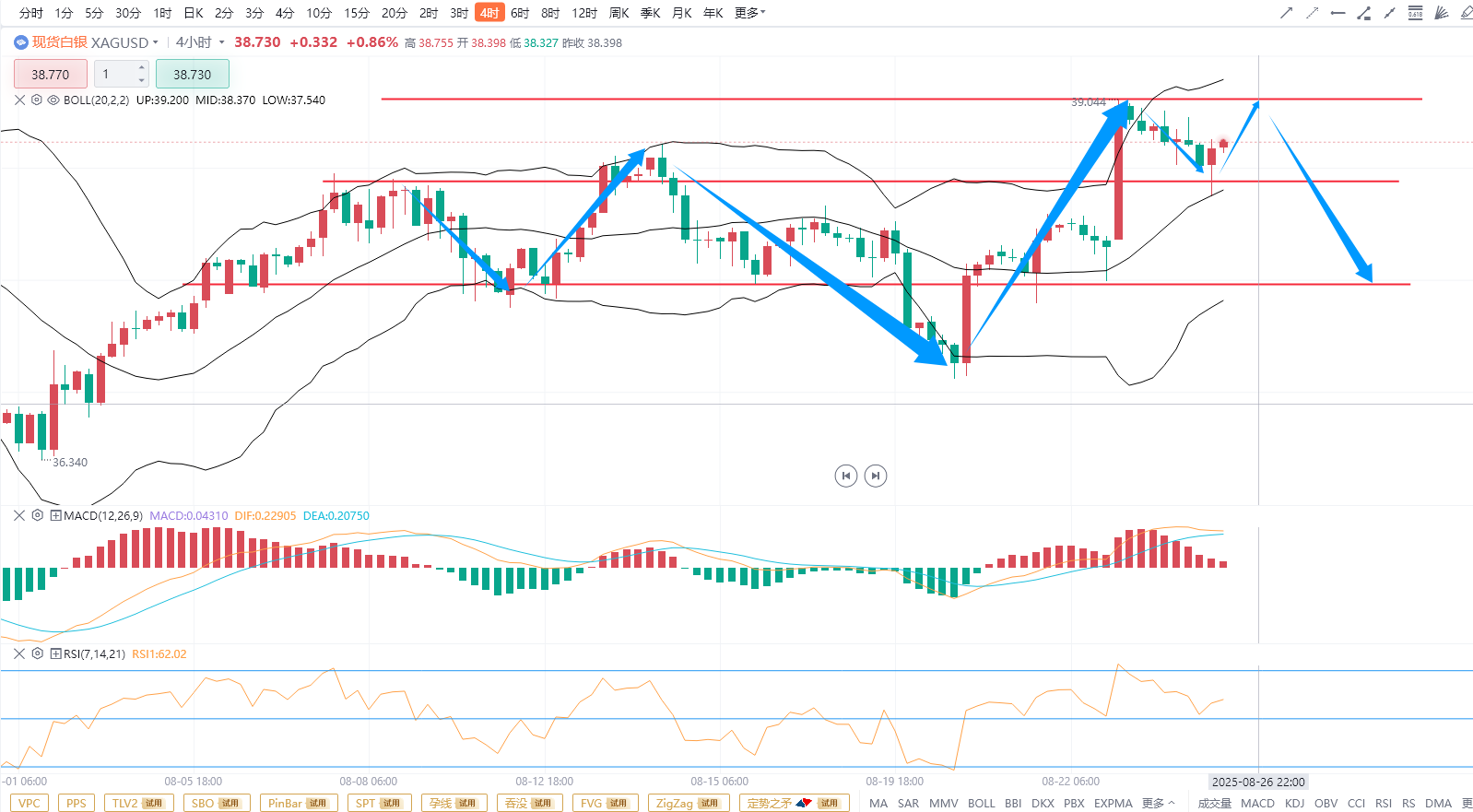这两天都把精力放在黄金和原油了,白银在背后悄没声息波动也挺大的,今早白银价格延续昨晚的走势下跌的走势,变动不是很大,整个区间是在39.044-38.436。所以白银日内以低空为主。