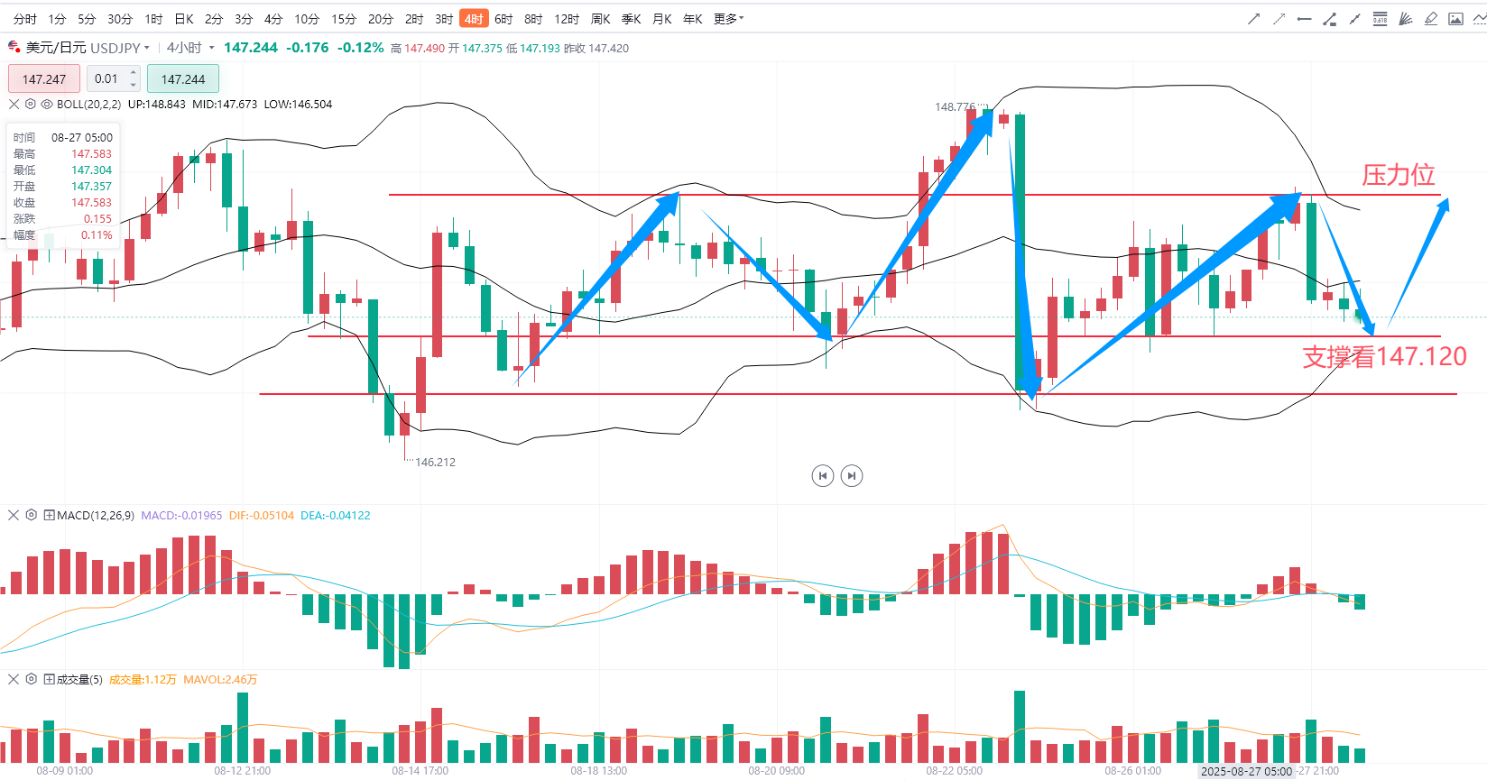 四小时级别这波下跌还在继续,已经收出三连阴形态。下方支撑看到147.120的位置,若后续下跌突破支撑线,进一步下探看到147.570。反之若碰到支撑反弹,则进场布局空单上方看到148.120。结合MACD图看前期回调持续的时间比较短,所以现在延续之前的大趋势继续下跌,并且死叉刚出现,下跌动能柱也在进一步放量。综合来看下跌还在继续,后面继续看跌。