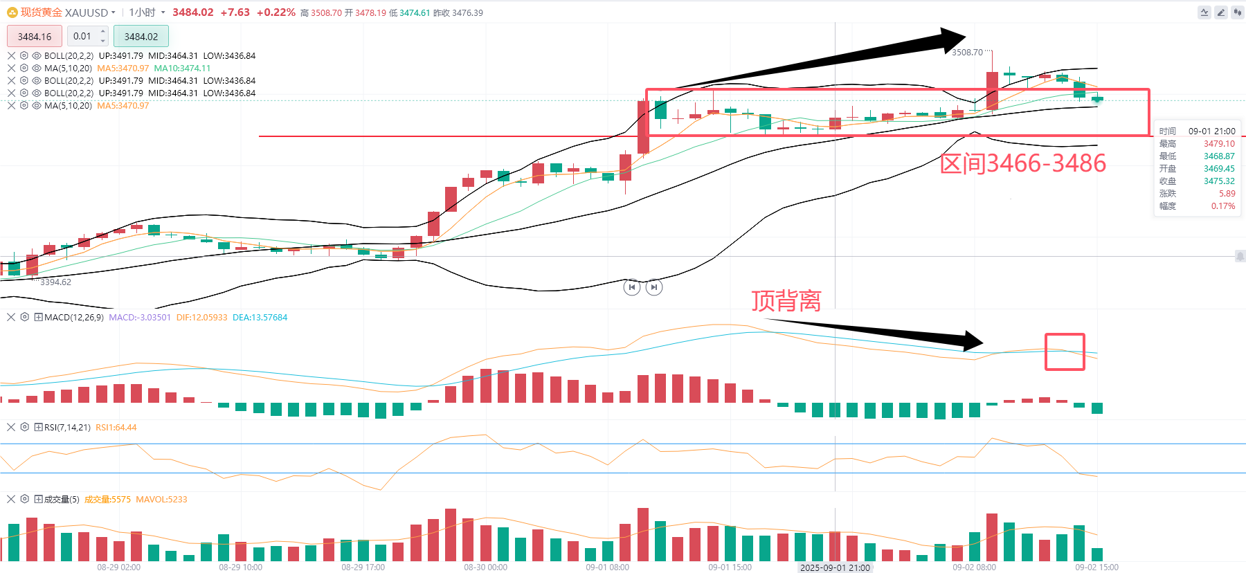 一小时级别出现非常明显的顶背离,顶背离出现之后K线开始向下修复这段背离,说明此时空方力量开始变强。结合MACD图快慢线死叉已经出现,下跌动能柱也在持续放量,接下来金价将会迎来下跌走势。k线整个区间是在3466-3486之间,重点关注下方3466的支撑。