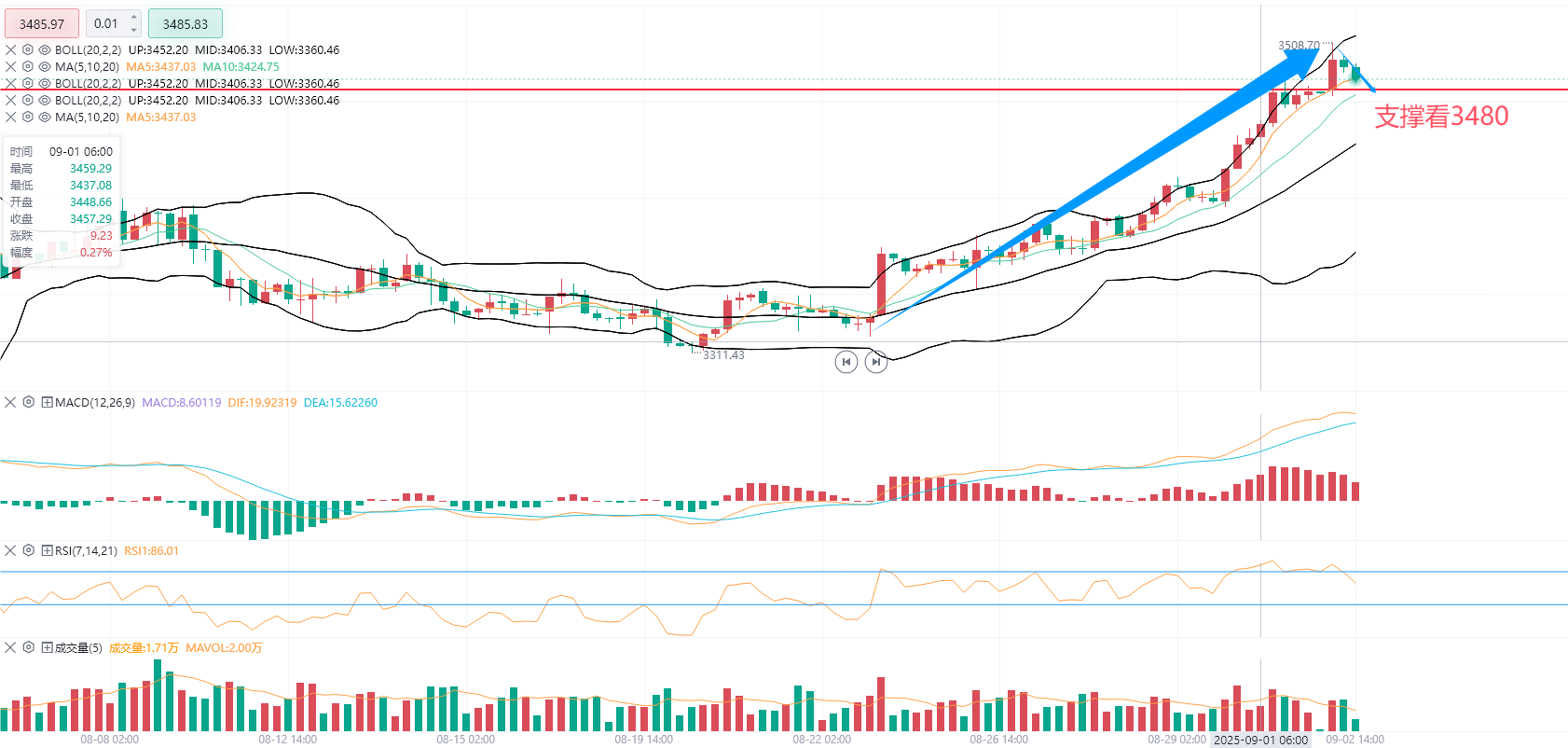 今天早上国际黄金终于站上3500的新高了,甚至是走到3508的位置,经过前期震荡走势,终于在8月末9月初站上高位,怎么说呢还挺激动的,这行情真不简单,按照之前的情况来说,昨晚上行情大概率是没有什么大变化的,但是今早直接冲高3508的高点,见证历史新高了算是,在来一波上涨估计有点危险,所以今天思路整体以高空为主。