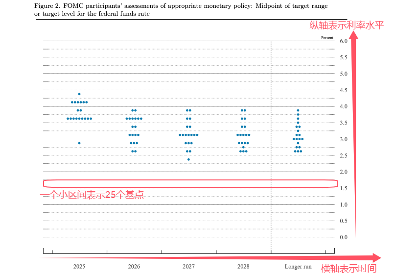 纵轴表示联邦基金利率,一个小区间是25个基点,例如图中标出的区间是在1.5%-1.75%.那如果一个点落在4.5%-4.75%之间,就代表这个官员认为某个时间点的利率应该在4.5%-4.75%。