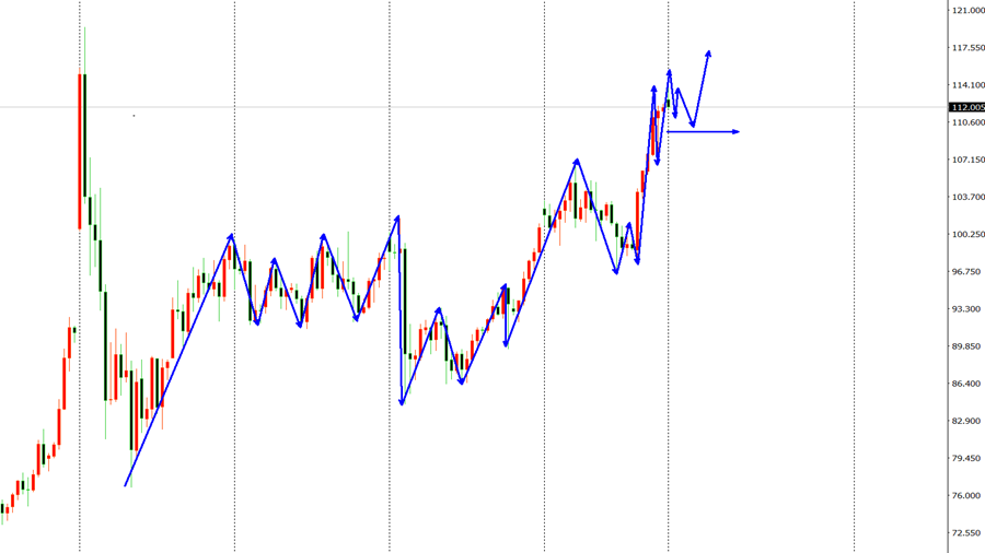 上周四美原油市场早盘开盘在98.9美元/桶,后行情回踩97.66美元/桶,后行情受到美国总统强势讲话影响强势拉升,日线最高触及到了114.2的高点后整理,日线最终收线在了112.1美元/桶,后日线以一根上影线长于下影线的大阳线收线,周线级别再次收录一根大阳线,触及前期高点附近。而这样的形态收尾后,原油多头持续考验中。综合来看,高博景总结:原油持续冲高,多头依旧占据主动,今日操作上考虑回撤布局多单为先,高空辅助,上方关注115.5-120.0美元阻力,下方关注110.0-106.0美元支撑。
