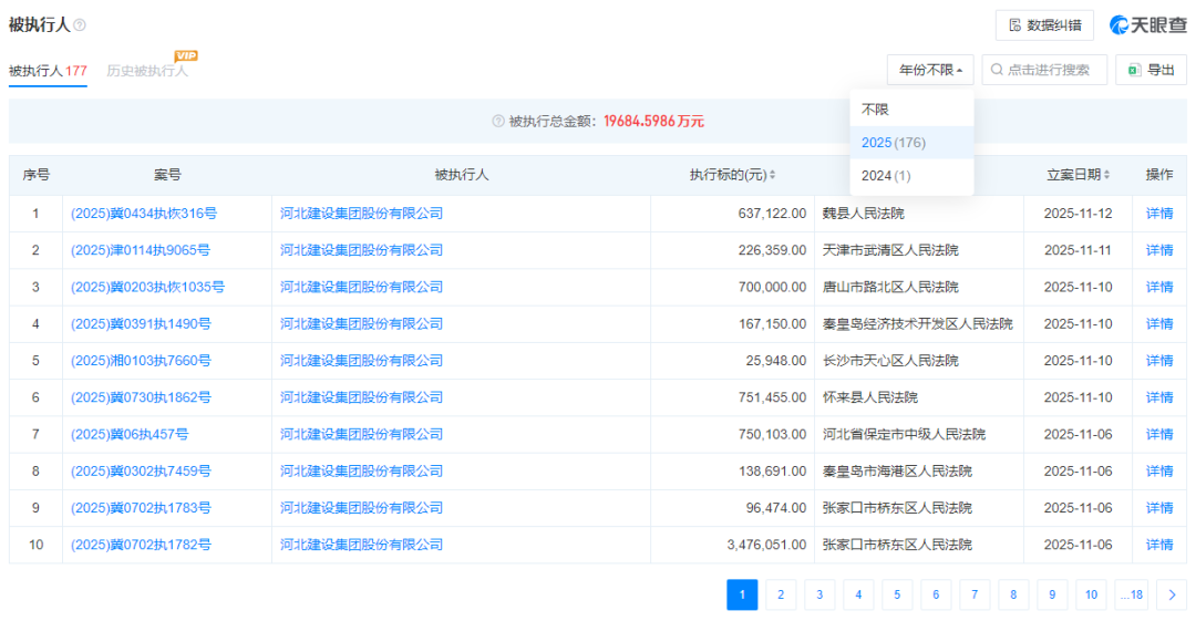 天眼查显示,截至11月12日,河北建设集团股份有限公司一共有177条被执行人信息,其中176条发生在2025年,被执行总金额高达1.97亿元。而河北建设集团是保定银行的并列第五大股东。