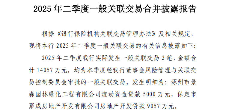 另据保定银行7月18日披露的2025 年二季度一般关联交易合并披露报告,该行2025年二季度实际发生一般关联交易2笔,金额合计14057万元,其中涿州市景森园林绿化工程有限公司流动资金贷款5000万元、保定市聚成房地产开发有限公司房地产开发贷款9057万元。