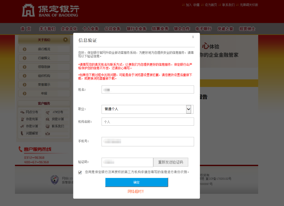 作者打开保定银行官网,找到年报这一栏,点击2024年年报,发现需要填写一系列信息,但是在填写和提交之后,弹出的是“网络超时”这4个字。随后,作者在各大相关网站检索,也未找到保定银行2024年年报。