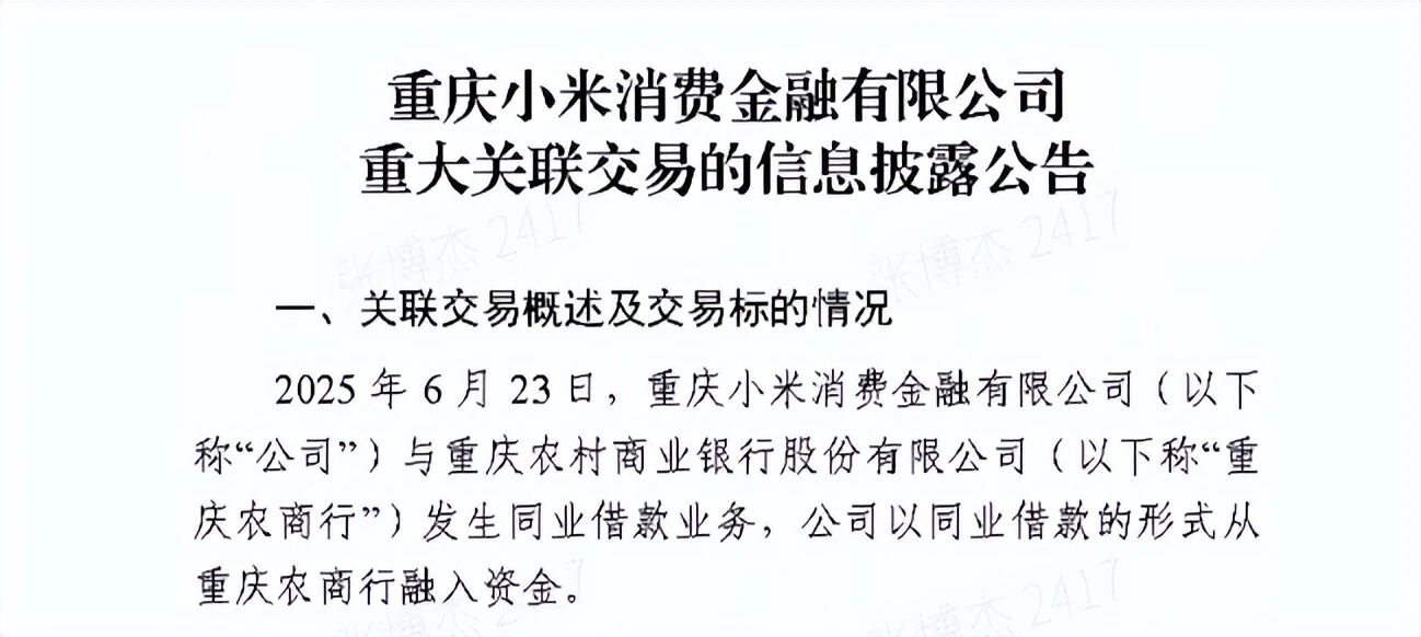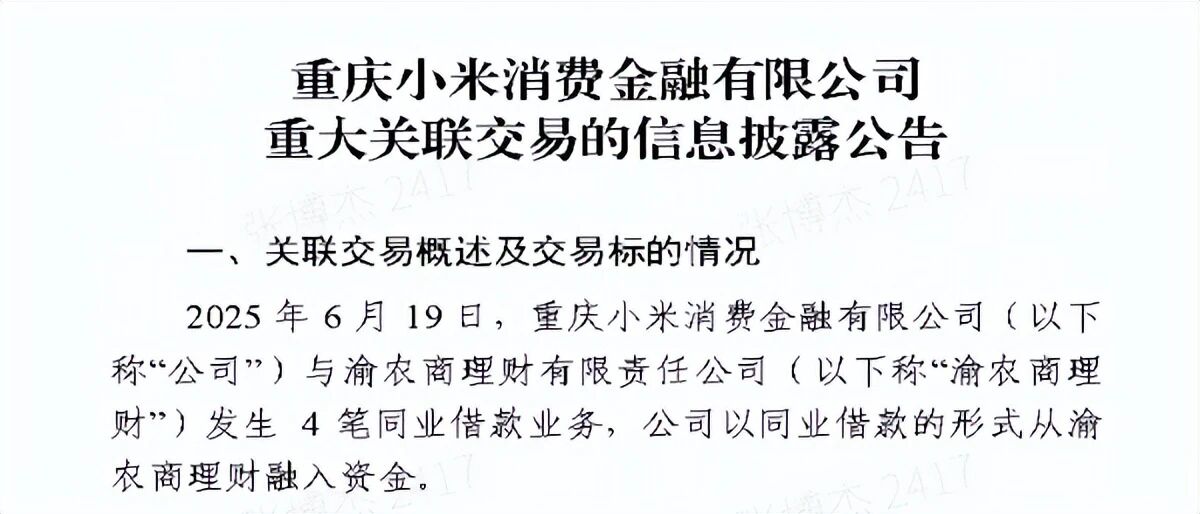 根据小米消金发布的公告,今年3月份到6月份,小米消金与重庆农商行发生3笔同业借款业务,以同业借款的形式从重庆农商行融入资金,分别是3月21日的1亿元、4月25日的2亿元和6月23日的2亿元,总金额达到了5亿元。