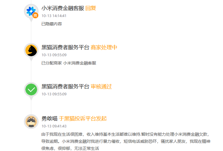 一条发布于10月13日的投诉则写道:“由于我现在生活很困难,收入维持基本生活都难以维持,暂时没有能力处理小米消费金融欠款,导致逾期。小米消费金融对我进行暴力催收,短信电话威胁恐吓,骚扰家人朋友,我现在精神很焦虑,很抑郁,无法正常生活。”