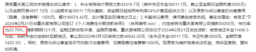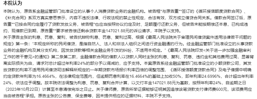 根据企业预警通的信息,今年8月28日河南省信阳市平桥区人民法院发布的民事判决书(6月3日判决)显示,小米消金请求法院判令被告程某按年利率24.7%的标准计算罚息、复利,但是法院认为这超出了24%,依法应予调整,按照年利率24%计算((2025)豫1503民初3053号)。