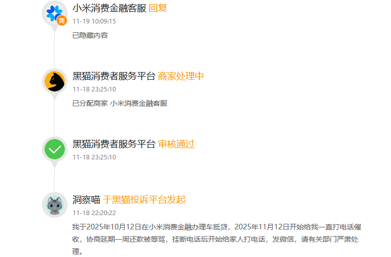 一条发布于11月18日的投诉(投诉编号:17390004226)写道:“我于2025年10月12日在小米消费金融办理车抵贷,2025年11月12日开始给我一直打电话催收,协商延期一周还款被辱骂,挂断电话后开始给家人打电话,发微信,请有关部门严肃处理。”