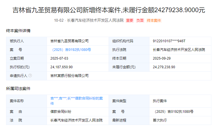 今年9月29日,长春汽车经济技术开发区法院发布的公告显示,九圣贸易总经理刘耀文被限制高消费。此外,九圣贸易成为被执行人,执行标的为2418.77万元,未履行金额为2427.92万元。