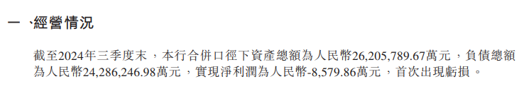 2024年第三季度财务数据概要显示,截至2024年三季度末,九台农商行合并口径下资产总额为2620.58亿元,负债总额为2428.62亿元,亏损8579.86万元,这也是该行首次出现亏损。