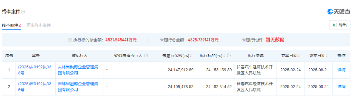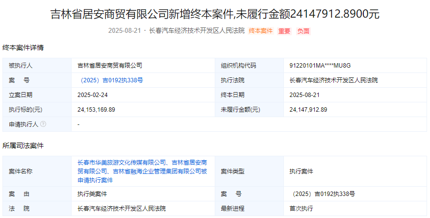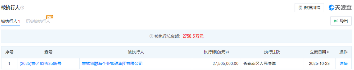 到了10月23日,融海集团新增一条被执行人记录,执行标的为2750.5万元,执行法院为长春新区人民法院((2025)吉0193执3586号)。算上前面两条,执行标的总金额高达7576.24万元。