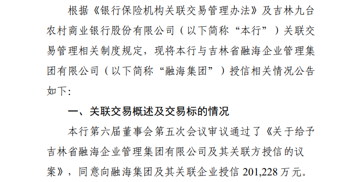 九台农商行2024年12月16日发布公告称,该第六届董事会第五次会议审议通过了《关于给予吉林省融海企业管理集团有限公司及其关联方授信的议案》,同意向吉林省融海企业管理集团有限公司及其关联企业授信201228万元。