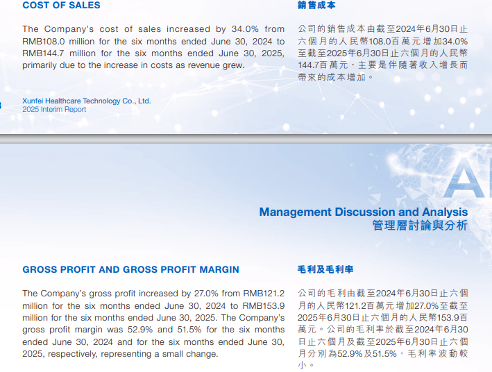 尽管如此,销售成本的上涨速度,可能会成为讯飞医疗提高利润的一大阻碍。半年报显示,讯飞医疗2025年上半年销售成本为1.45亿元,相比上年同期的1.08亿元增加了34%,比营收30.3%的增幅要高出3.7%,这也导致讯飞医疗的毛利从上年同期的52.9%降至2025年上半年的51.5%。