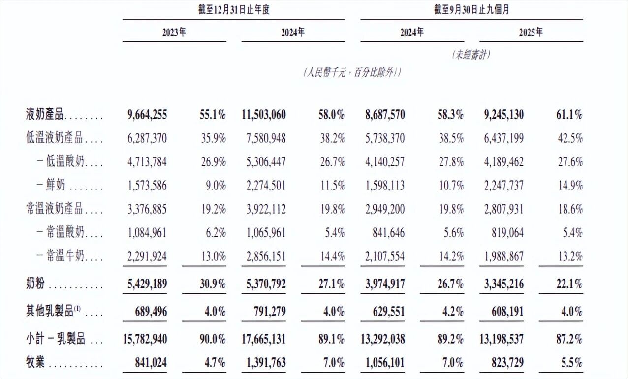从招股书来看,在乳业市场整体不佳的情况下,君乐宝依旧保持着不错的态势,2025年前三季度实现了净利润同比增长24.93%,归母净利润更是同比增长29.56%。君乐宝的业绩增长主要在于低温液奶的持续增长,2025年前三季度,君乐宝低温液奶的营收达到64.37亿元,占营收的比重已提升至42.5%。