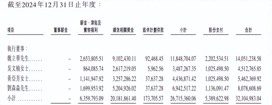 拿到高额分红的魏立华,薪酬也不低。招股书显示,2024年度,魏立华的薪酬为1405.12万元,其中薪金、津贴及实物福利265.38万元,绩效相关奖金910.24万元、退休计划供款9.25万元、股份支付220.25万元。