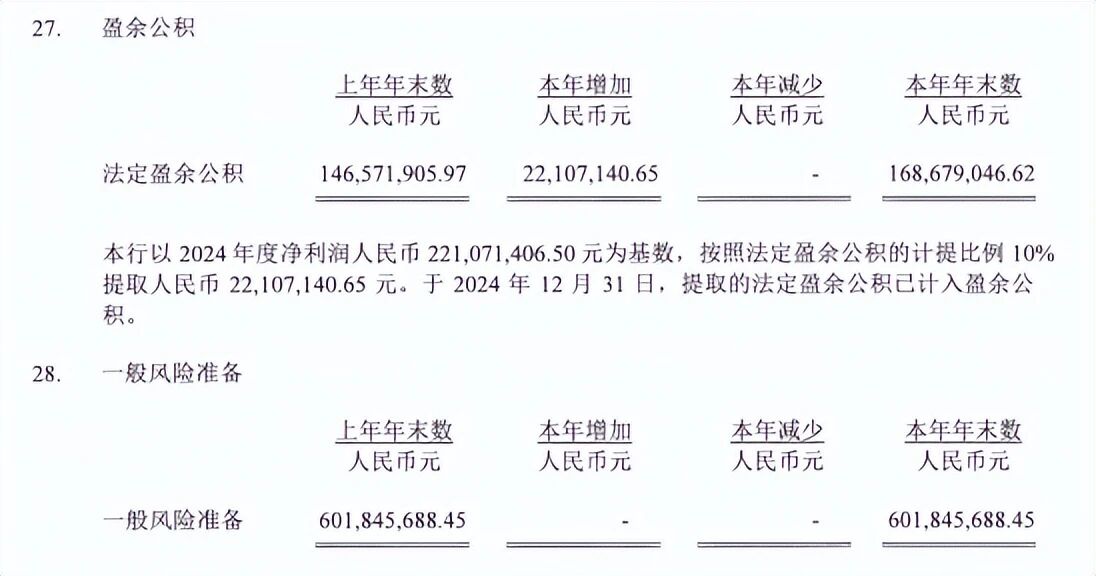 截至2024年12月31日,华瑞银行的法定盈余公积达到了1.68亿元,该行在2024年提取了2210.71万元,也就是当年净利润2.21亿元的10%。