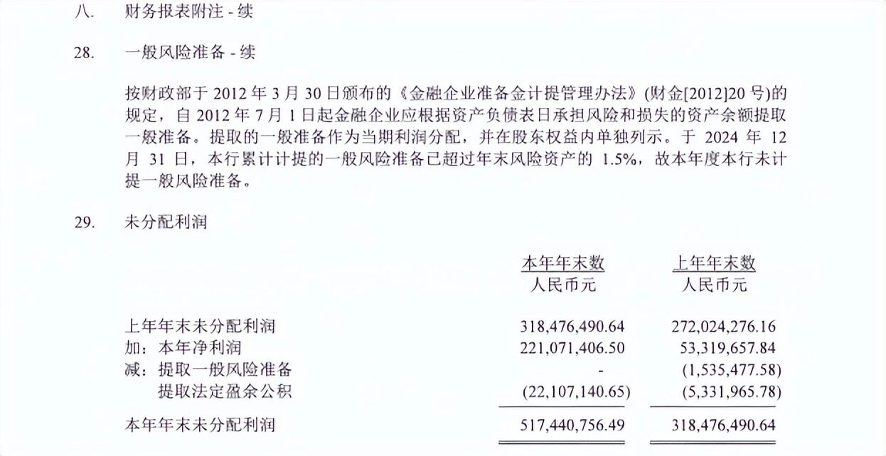 一般风险准备则是达到了6.02亿元,按照2024年年报的说法,华瑞银行于2024年12月31日累计计提的一般风险准备已经超过年末风险资产的1.5%,所以在2024年度未计提一般风险准备。