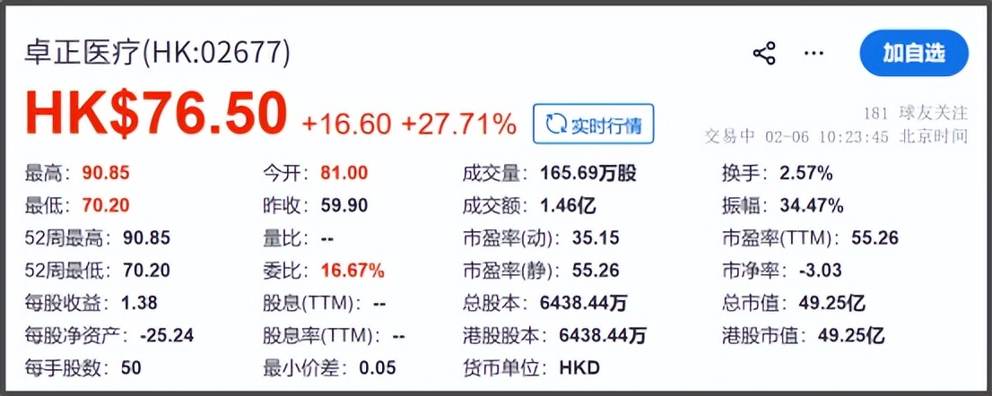 挂牌前的暗盘阶段,卓正医疗最高涨幅达105%,正式挂牌首日亦维持高开走势,盘中涨幅一度超50%,股价最高逾90港元/股。截至上午10时20分左右,卓正医疗股价报76.5港元/股,涨幅27.71%,总市值49.25亿港元。