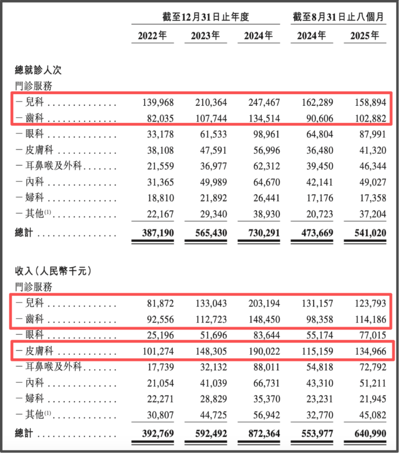 若细分来看,儿科及齿科是卓正医疗最受欢迎服务,其中2024年其儿科接诊人次约24.75万,贡献收入约2.03亿元,占总营收的比重超两成。