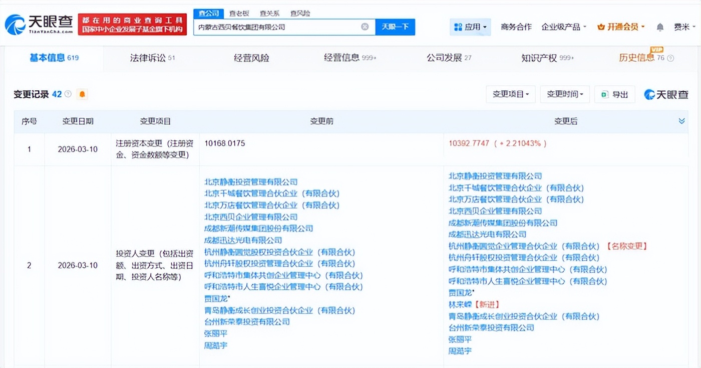 3月16日,天眼查工商信息显示,近日内蒙古西贝餐饮集团有限公司发生工商变更,新增林来嵘为股东,公司注册资本由约1.02亿元人民币增至约1.04亿元人民币。林来嵘于2月14日完成认缴出资224.7572万元,获得西贝餐饮集团超2.16%的持股,其首次持股日期为3月10日。