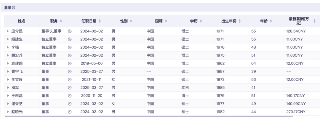 董事会成员信息概览,来源:同花顺财经
