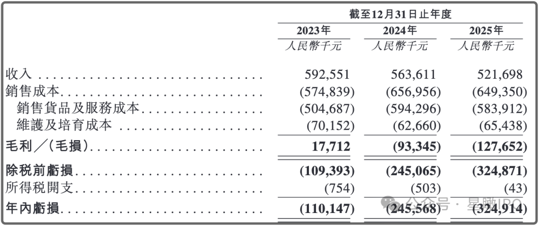 然而,这一本领并未有效转化为财务上的盈利。2023年—2025年,公司收入分别为5.93亿元、5.64亿元和5.22亿元,呈逐年下滑的态势;期内亏损从1.1亿元扩大至3.25亿元,毛利由正转负,分别为3.0%、-16.6%及-24.5%。