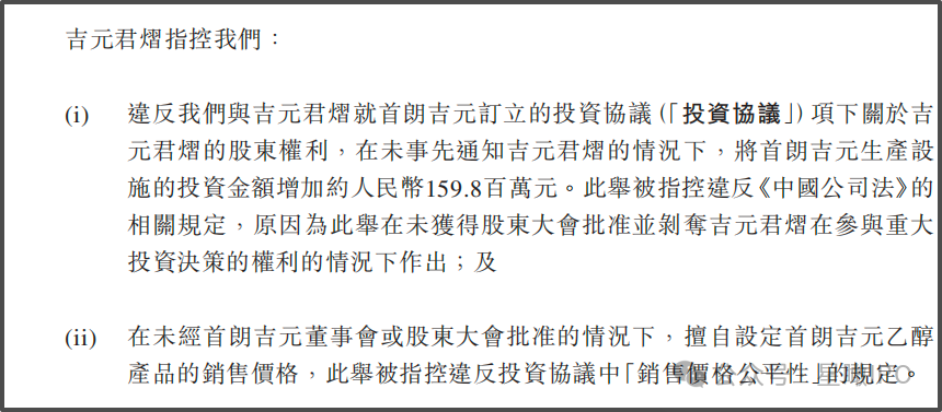 据相关公告,吉元君熠指控首钢朗泽擅自将首朗吉元生产设施的投资金额增加约1.598亿元,以及擅自设定首朗吉元乙醇产品的销售价格。