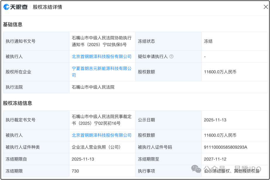 此外,《星岛》也注意到,2025年11月,石嘴山市中级人民法院冻结了首钢朗泽持有的首朗吉元1.16亿元股权,冻结期限至2027年11月。