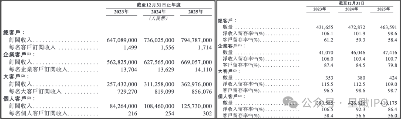 总体来看,群核科技无论是来自企业客户、大客户还是个人客户的单位客户订阅收入都有所增加。然而除大客户外,无论是企业客户还是个人客户的留存率都在下降,总客户留存率也从2023年的61.2%下滑至2025年的58.4%,总客户的净收入留存率也从2023年的106.1%下滑至2025年的98.6%。