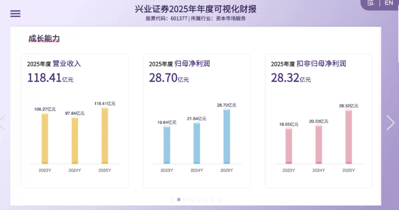 财报数据显示,截至2025年末,兴业证券总资产达3450亿元、净资产667亿元,实现双位数增长;全年营业收入118.41亿元、净利润37.14亿元,同比分别增长21.03%和28.21%,净资产收益率(ROE)同比提升1.12个百分点,整体经营业绩稳步向好。