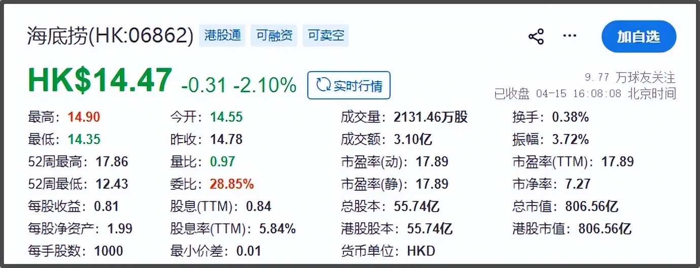 截至4月15日港股收盘,海底捞报收14.47港元/股,市值约806亿港元。