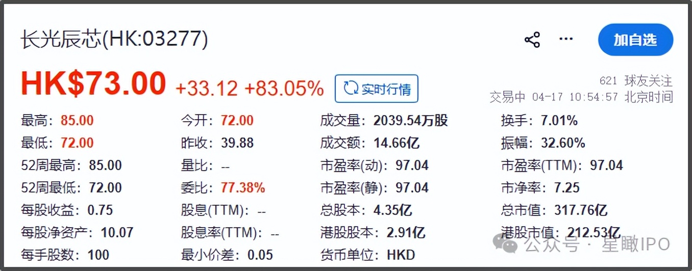 截至4月17日11时左右,长光辰芯报73.港元/股,涨83.05%,市值达317.76亿港元。