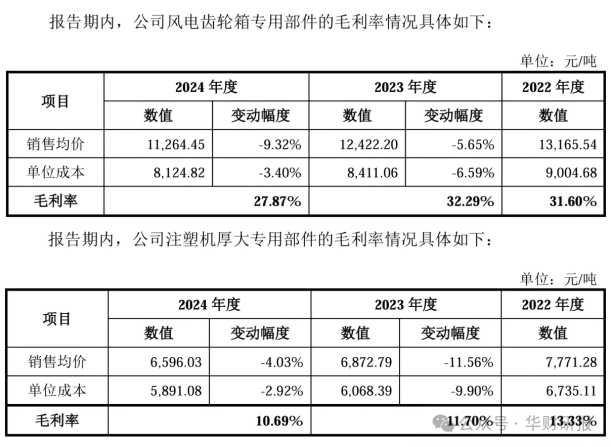 另外,占公司主营业务收入不到15%的另一项业务——注塑机厚大专用部件,销售价格的降幅也远高于成本降幅。2021年至2024年,注塑机厚大专用部件销售价格从7808.08元/吨降到6596.03元/吨,每吨降低了1212.08元,而每吨成本不过累计减少了429.91元。