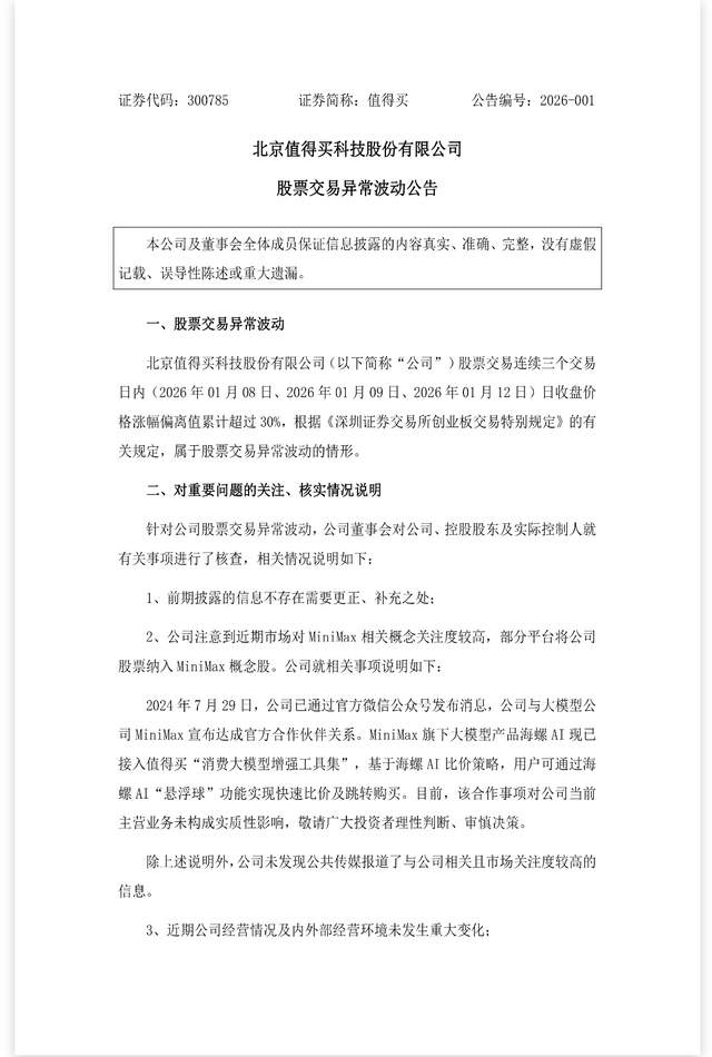 1月8日至12日,值得买(300785.SZ)连续三个交易日涨幅偏离值累计超30%,触发股票交易异常波动。