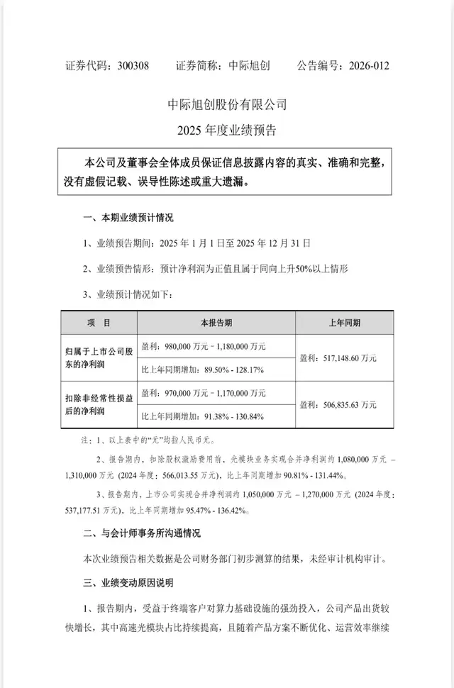 2026年1月30日,全球光模块龙头中际旭创(300308.SZ)交出了2025年度亮眼的业绩预告,预计全年归母净利润达98亿元-118亿元,同比增幅高达89.50%-128.17%,这份近乎翻倍的业绩答卷,成为AI算力赛道引人注目的成绩单。
