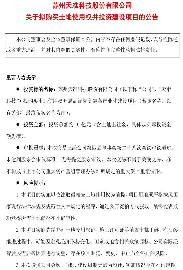 2026年3月27日,科创板工业视觉龙头天准科技(688003.SH)发布重磅扩产公告,拟以自有或自筹资金,在苏州市虎丘区科技城投建高端视觉装备产业化项目,项目总投资约10亿元(含土地出让金)。