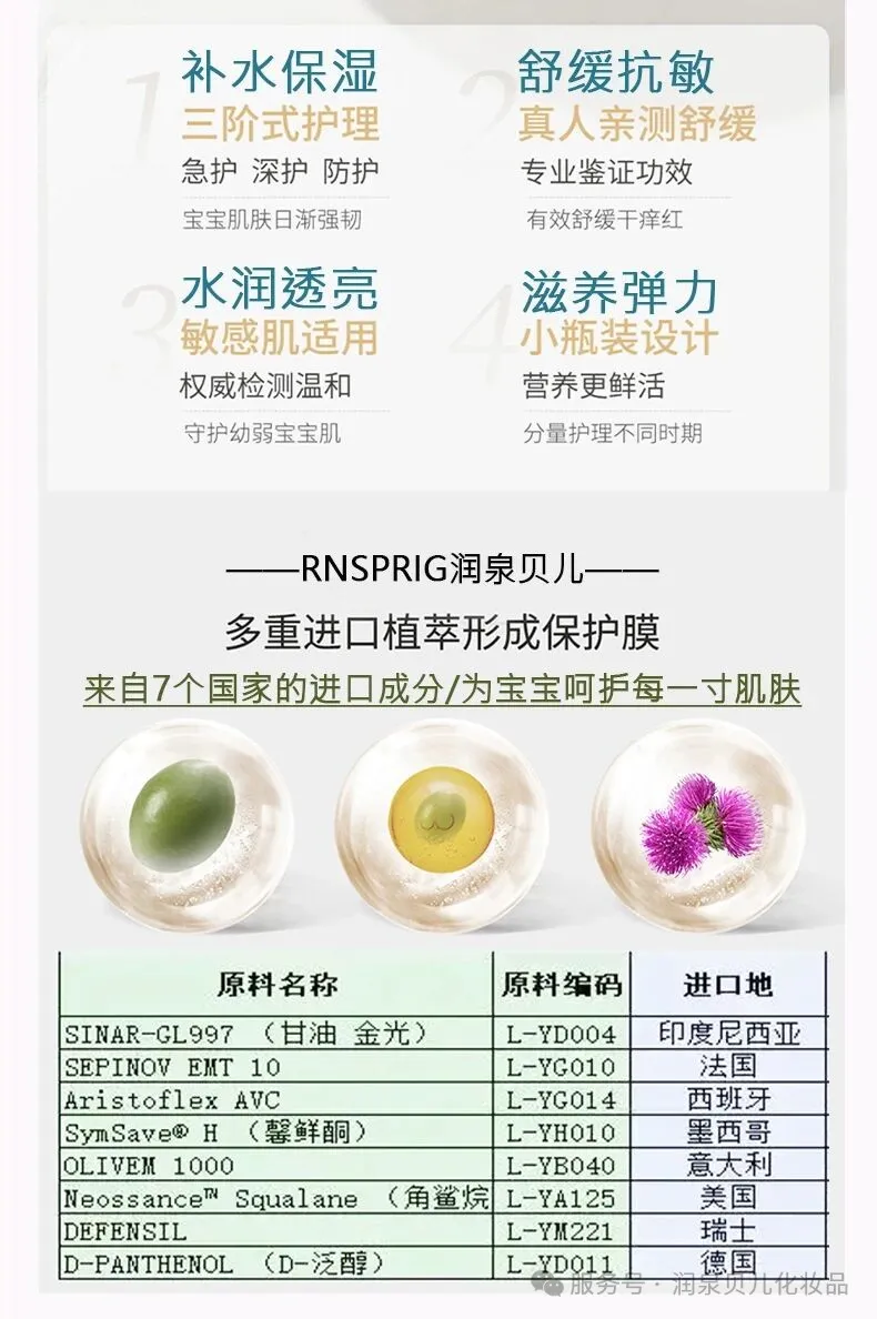 强化屏障,进口成分:特别添加的7个国家的进口成分:“法国---丙烯酸羟乙酯/丙烯酰二甲基牛磺酸钠共聚物、西班牙---丙烯酰二甲基牛磺酸铵/VP共聚物、美国---角鲨烷、墨西哥---对羟基苯乙酮、意大利---山梨坦橄榄油酸酯、瑞士---车前叶蓝蓟(ECHIUMPLANTAGINEUM)籽油、德国---泛醇;”像一层天然保护膜覆盖在宝宝肌肤表面,有效阻止水分流失,滋润肌肤。