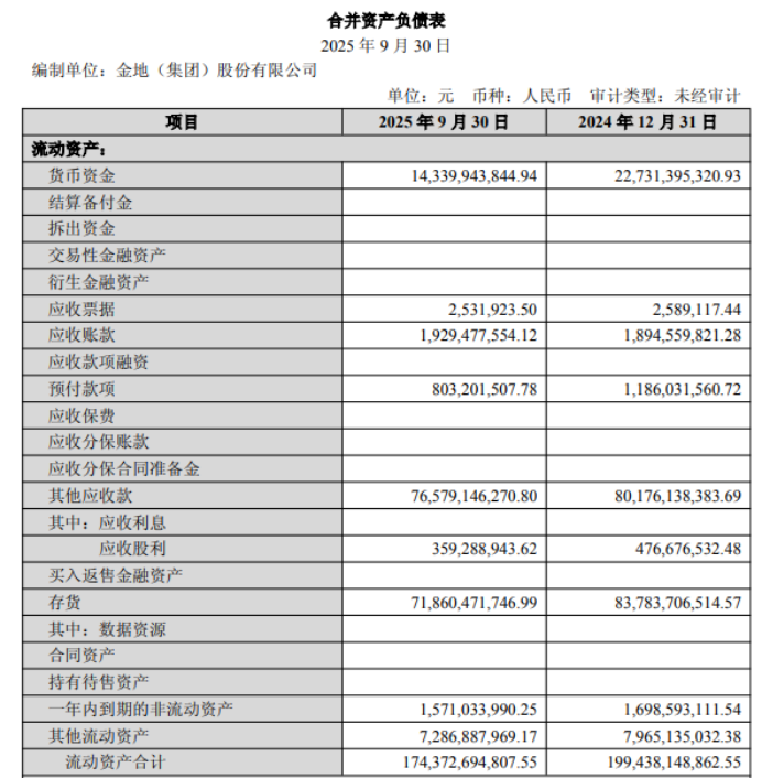 业绩亏损的同时,金地集团的现金流和债务状况日益严峻。货币资金方面,公司呈现持续缩水态势:2023年末货币资金为297.38亿元,2024年末降至227.31亿元,2025年6月末进一步减少至164.3亿元,较2024年末降幅达27.72%,较2023年末更是缩水44.75%。截至2025年三季度末,货币资金规模进一步减少至143.4亿元,而短期债务压力却居高不下。