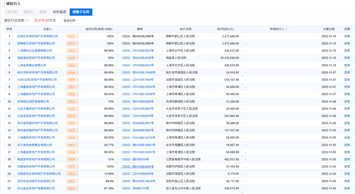 经营困境的连锁反应已蔓延至下属子公司,2025年以来,金地集团旗下大量控股子公司陆续被列为被执行人,反映出公司现金流风险的传导。