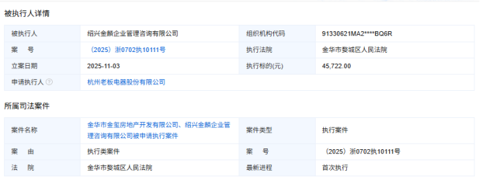 这些被法院判为被执行人的,许多是由金地的供应商申请执行的,比如金华市金玺房地产开发有限公司、绍兴金麟企业管理咨询有限公司就被老板电器申请了强制执行,执行金额仅有4.57万元。