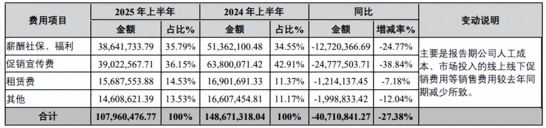 今年上半年,煌上煌的销售费用为1.08亿元,去年同期则是1.49亿元,同比减少了0.41亿元,同比下降27.38%。其中,销售人员的薪酬社保、福利今年上半年为3864.17万元,去年同期为5136.21万元,同比减少了1272.04万元,同比降幅为24.77%。