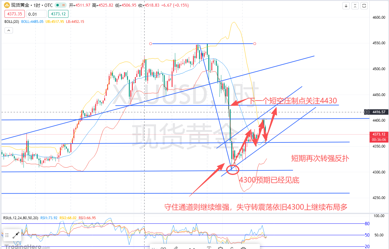黄金多头如期反扑,价格如若收复4400且站稳那么空间可以继续推移到4430-70甚至4500,日K来看严重超买后的报复性下跌修正导致短期由强转弱已完成报复性调整,4300守住之上对于中长线而言就是合适的上车位置,虽然价格短期4400受阻,博文当中提到过价格深跌250个点多头不可能一口气实现收复,而是伴随震荡上行或者时间换空间整理走法,4300既然稳住也向上测试了4400,那么短期节奏上就要调整过来主多辅空,小时来看多头趋势阶梯上行只有收复4400站稳基本就可以确认调整见底了,低点不断上移4300-4358-60,上方短期短空关注4430关口,收复4400且顶底转换继续看多头继续收复,提前就预期好了4325-20多看多头的卷土重来不要低位追空,就问大家思路是不是非常的给力!波段利润上来后减减仓继续上看,盘中情况我会临时给到实盘学员通知!