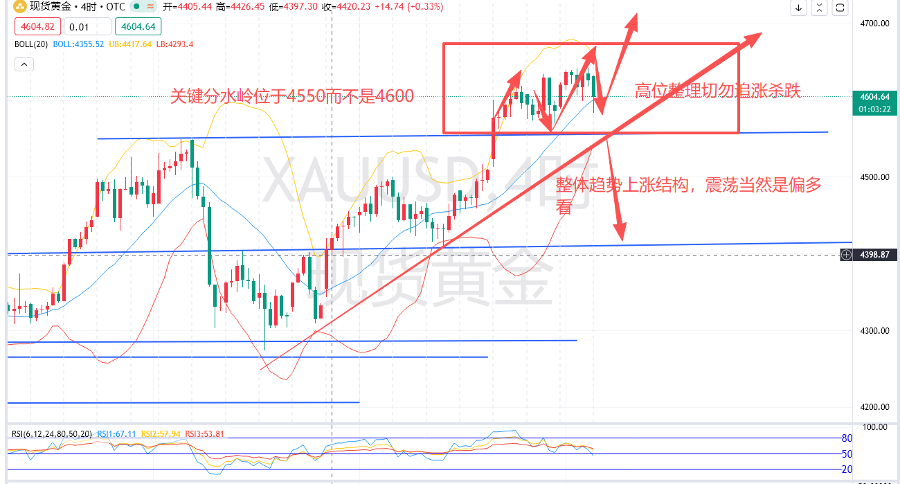 据CME“观察”:美联储1月降息25个基点的概率为5%,维持利率不变的概率为95%。到3月累计降息25个基点的概率为26%,维持利率不变的概率为72.8%,累计降息50个基点的概率为1.2%,官方对于本月降息的可能性不大,美联储利率维持不变的话对金银本身的涨势影响不大,届时还是要看会议内容是否带动后续的降息节奏,但在目前截止议息期间来看,金银能够保持涨势的话,就还有很大的上升空间技术上,4550之上保持看涨,同时也是确认4542中期顶部的关键一环,目前价格陷入震荡整理,也是高位多头的整理所以且不要过早预期顶部,技术上其实没太多要说的继续顺势,4550失守再说,总而言之日内操作上,目前位置价格不做参与,上方再次新高也得看美盘,所以短空也是有机会进行的,4635-40区域继续空目标4600破位看4680-70区域了结即可,下方4670-65(轻仓多),60-55补仓多下坡4550损,目标看50-100个点!现在价格做进去无疑来回扫,建议大家耐心等待机会!