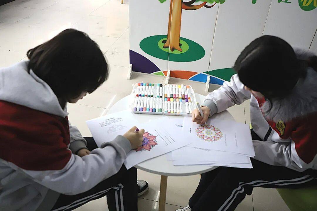 安静的绘画区内,学生手持彩笔,专注地填充着面前圆形图案的每一个细节。色彩在纸上蔓延,思绪在涂抹中沉淀。这种被称为“曼陀罗绘画”的方式,通过简单的重复与色彩搭配,让注意力自然回归当下。无需任何绘画基础,只需跟随此刻的感受选择颜色,笔尖划过纸张的过程,本身就成为了一种温和的情绪梳理。