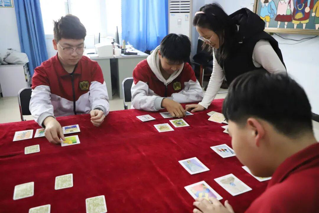 一组铺开着各式图像卡片的桌旁,同学们安静地浏览、挑选,被某张卡片瞬间吸引的背后,往往是内心某种感受或期待的投射。在心理老师的温和引导下,透过对所选卡片的自由联想,一段通向自我觉察的“无声对话”悄然展开。