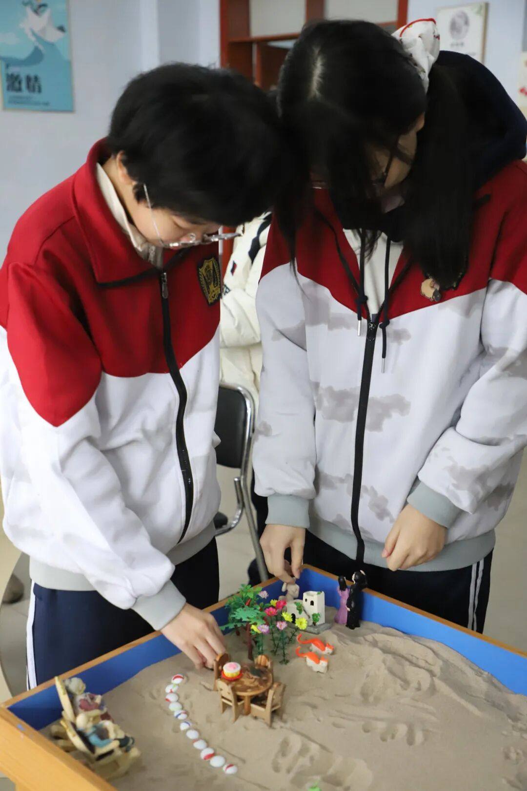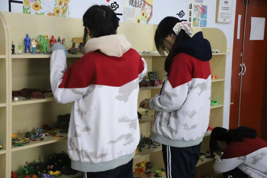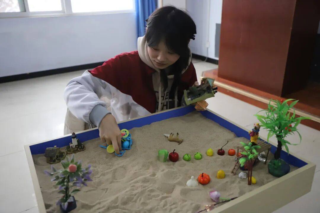 细腻的沙粒被抚平,成为一片等待创造的“土地”。同学们从陈列架上选取各式微缩模型——房屋、树木、桥梁、人物,在沙盘上搭建属于自己的场景。这个看似游戏的过程,实则是内心世界的无声表达。指尖划过沙粒的触感,物件摆放时的思考与调整,都在不知不觉中帮助整理思绪,让模糊的感受变得清晰可见。